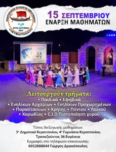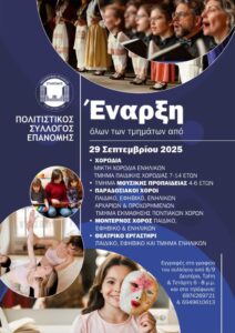 Εγγραφές και έναρξη μαθημάτων στον Πολιτιστικό Σύλλογο Επανομής. Πληροφορίες στα τηλέφωνα της αφίσας