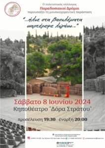 Ο πολιτιστικός σύλλογος “ΠΑΡΑΔΟΣΙΑΚΟΙ ΔΡΟΜΟΙ” σας προσκαλεί το Σάββατο 8 Ιουνίου 2024 (ώρα προσέλευσης 19:30,…Continue reading→