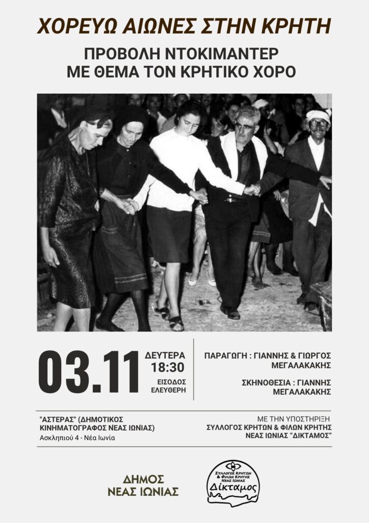 - Η προβολή του ντοκιμαντέρ θα πραγματοποιηθεί με την υποστήριξη του Δήμου Νέας Ιωνίας και του Συλλόγου Κρητών και Φίλων Κρήτης Νέας Ιωνίας “Δίκταμος”